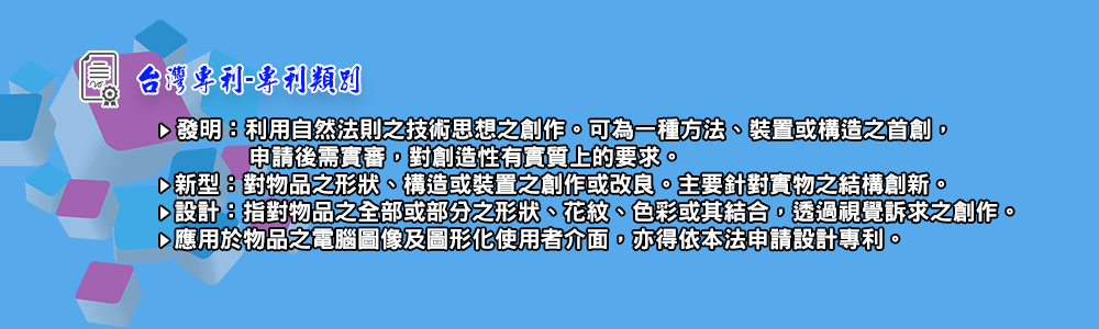 | 發明:自申請日起算20年 / 新型:自申請日起算10年 / 設計:自申請日起算12年。 |